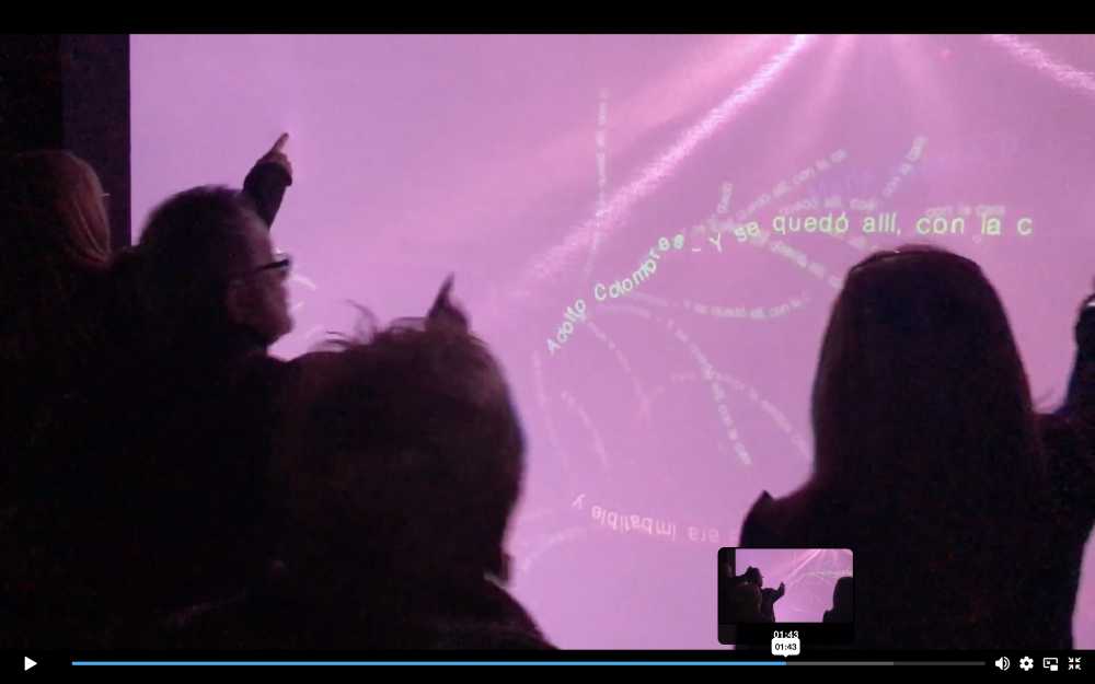 Sobre una gran pantalla elástica y sensible al tacto de 5 metros de ancho, los textos emergen a medida que los visitantes deslizan sus dedos, revelando palabras escondidas y estableciendo un vínculo físico con la escritura.
