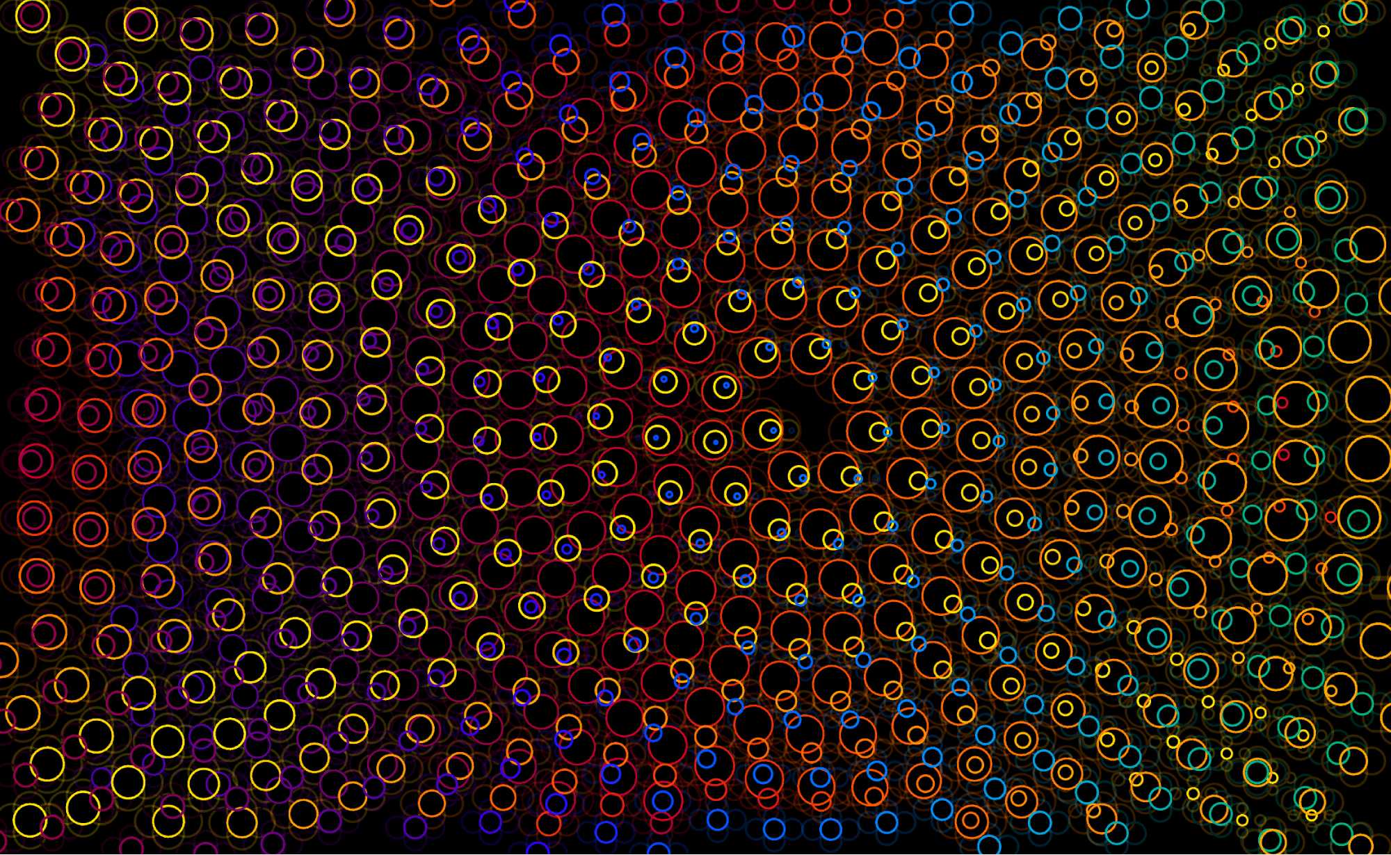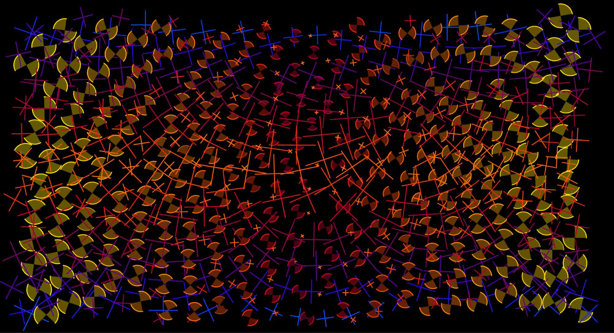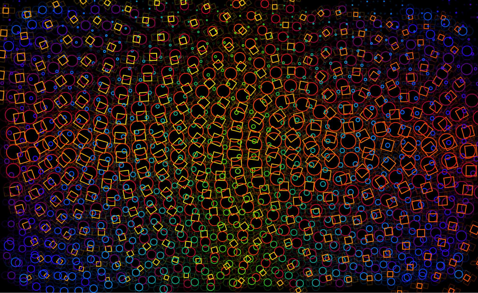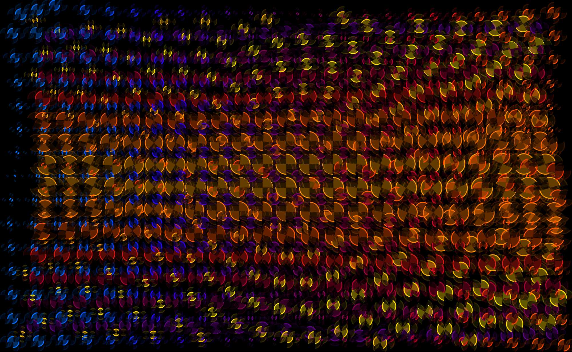 Distribuciones se manifiesta como una serie de variaciones generativas. Cada ejecución da lugar a combinaciones singulares: número de elementos, sentidos de giro, transiciones cromáticas, ritmos de aparición. Algunos elementos se conservan como estructuras constantes; otros varían al azar, dando lugar a un repertorio inagotable dentro de un mismo universo formal. La obra no busca una forma definitiva, sino un campo de posibilidades en constante devenir.