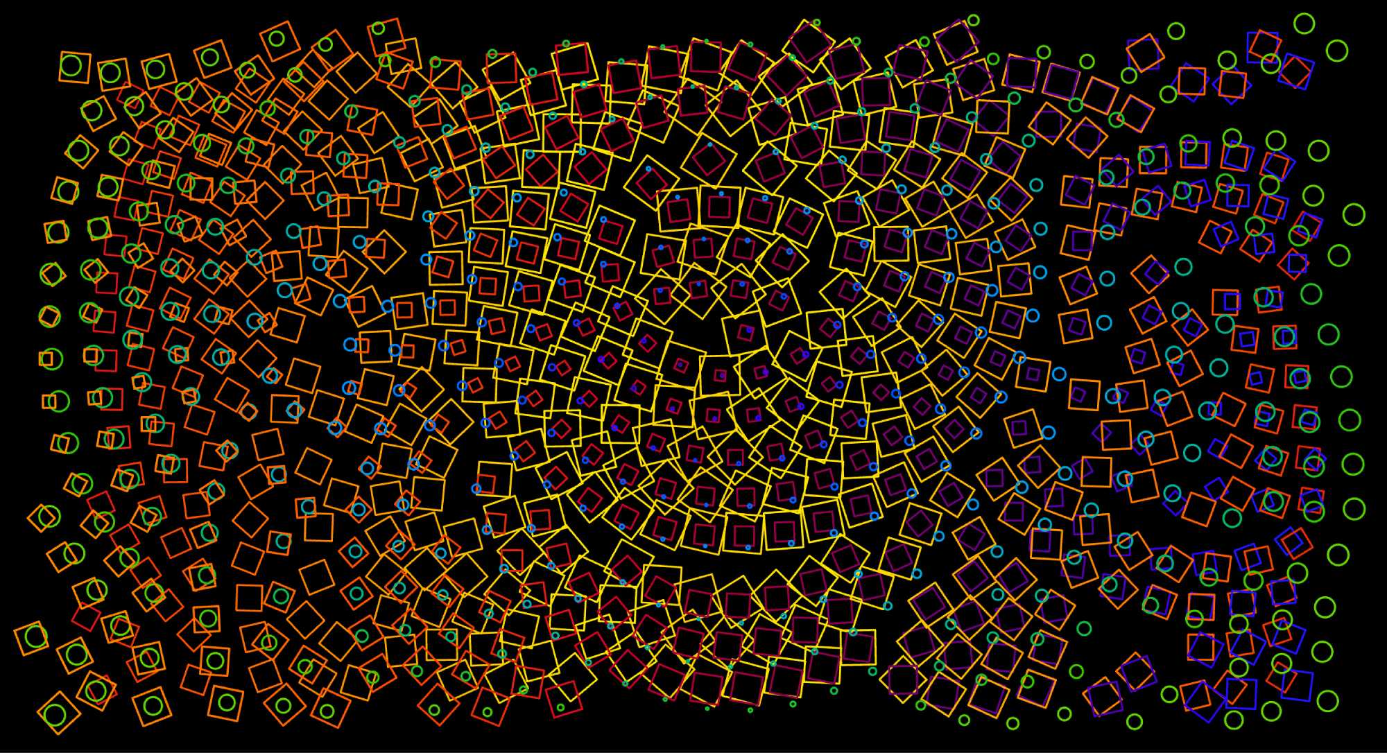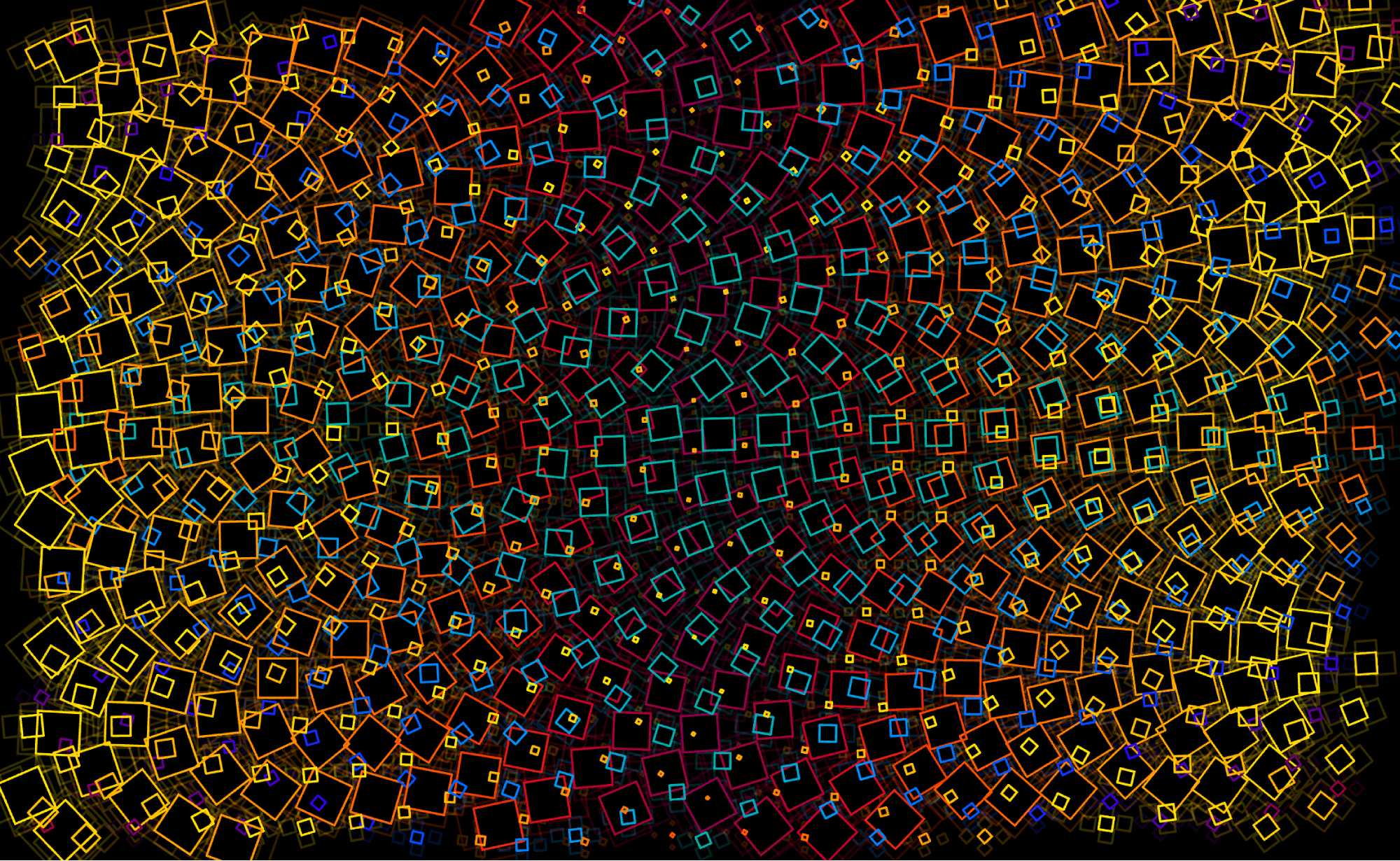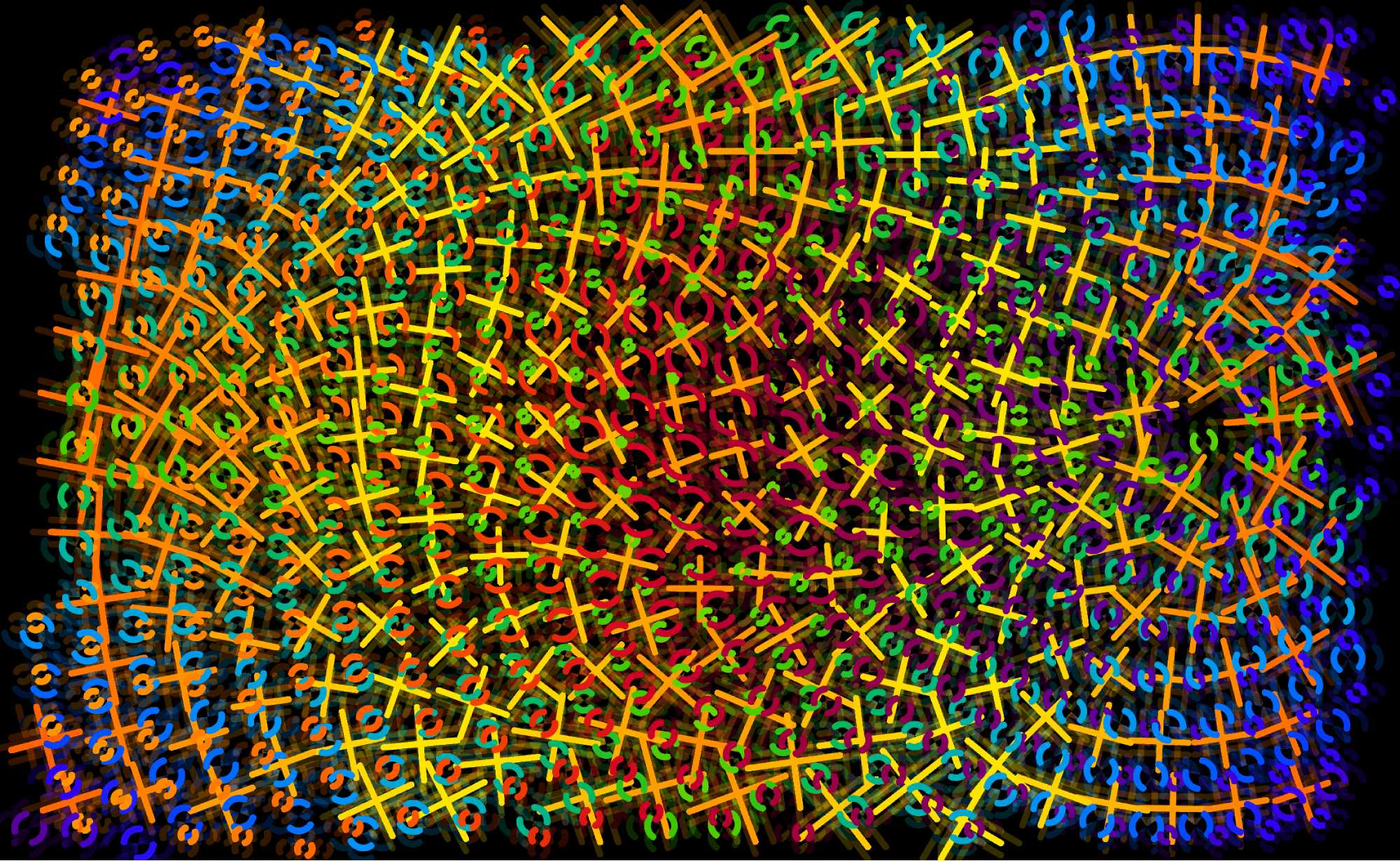 Distribuciones se manifiesta como una serie de variaciones generativas. Cada ejecución da lugar a combinaciones singulares: número de elementos, sentidos de giro, transiciones cromáticas, ritmos de aparición. Algunos elementos se conservan como estructuras constantes; otros varían al azar, dando lugar a un repertorio inagotable dentro de un mismo universo formal. La obra no busca una forma definitiva, sino un campo de posibilidades en constante devenir.