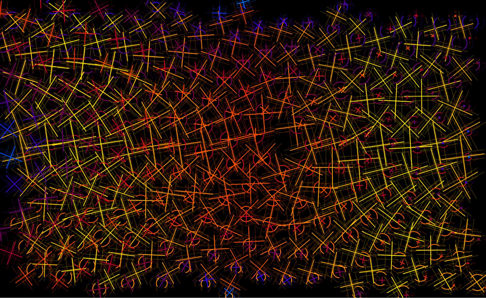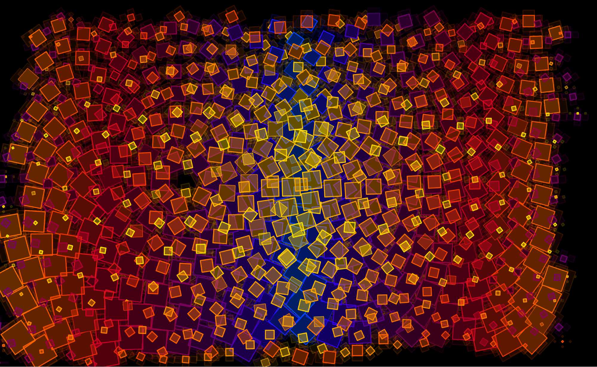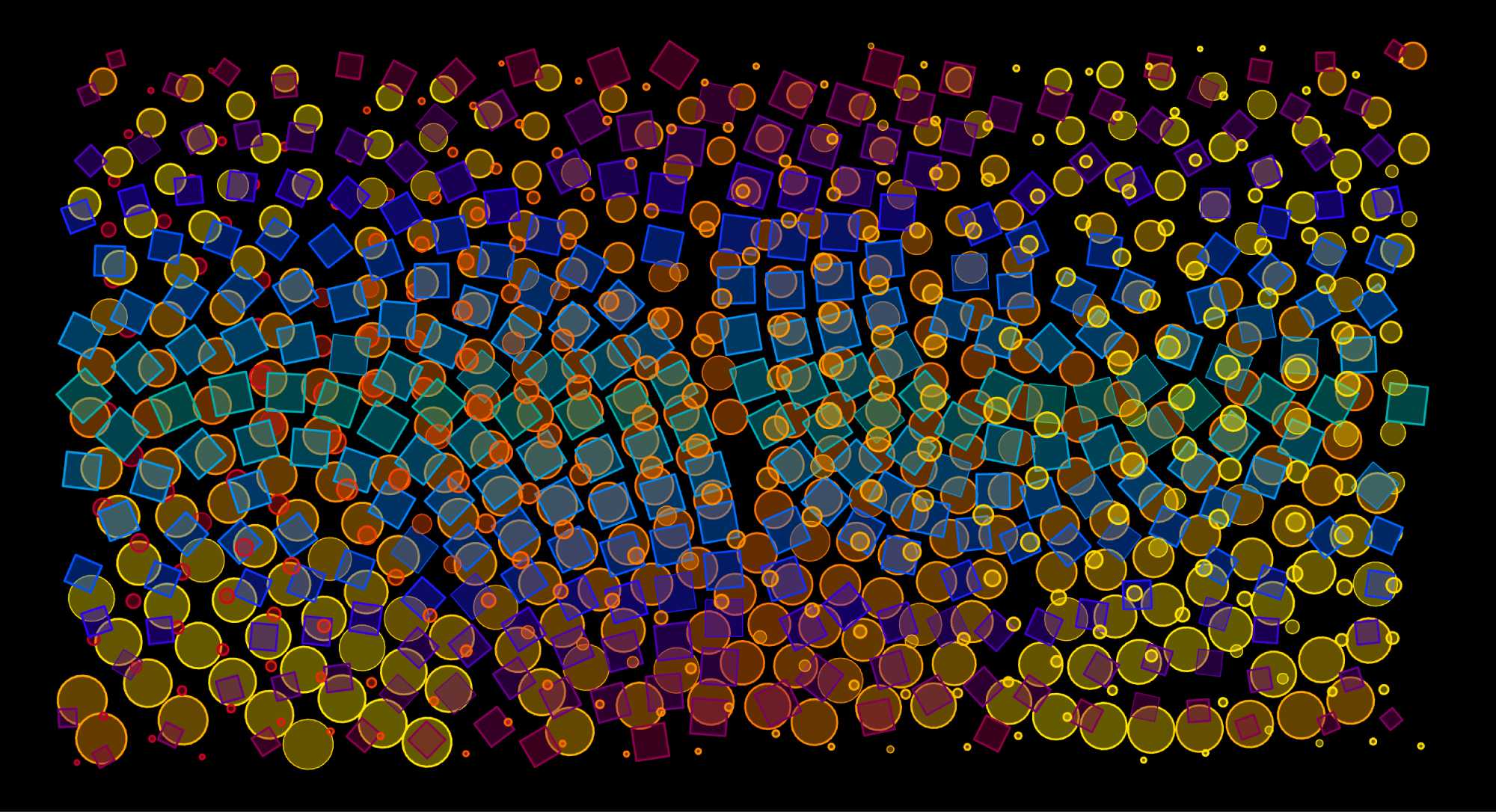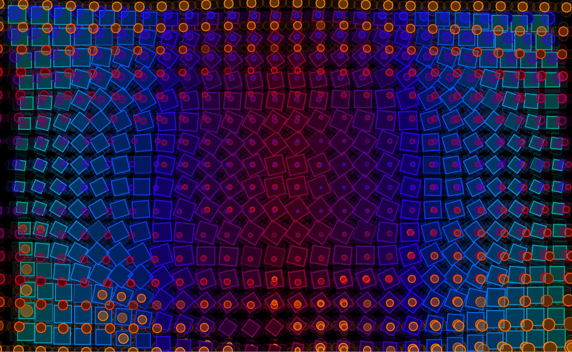 Distribuciones se manifiesta como una serie de variaciones generativas. Cada ejecución da lugar a combinaciones singulares: número de elementos, sentidos de giro, transiciones cromáticas, ritmos de aparición. Algunos elementos se conservan como estructuras constantes; otros varían al azar, dando lugar a un repertorio inagotable dentro de un mismo universo formal. La obra no busca una forma definitiva, sino un campo de posibilidades en constante devenir.