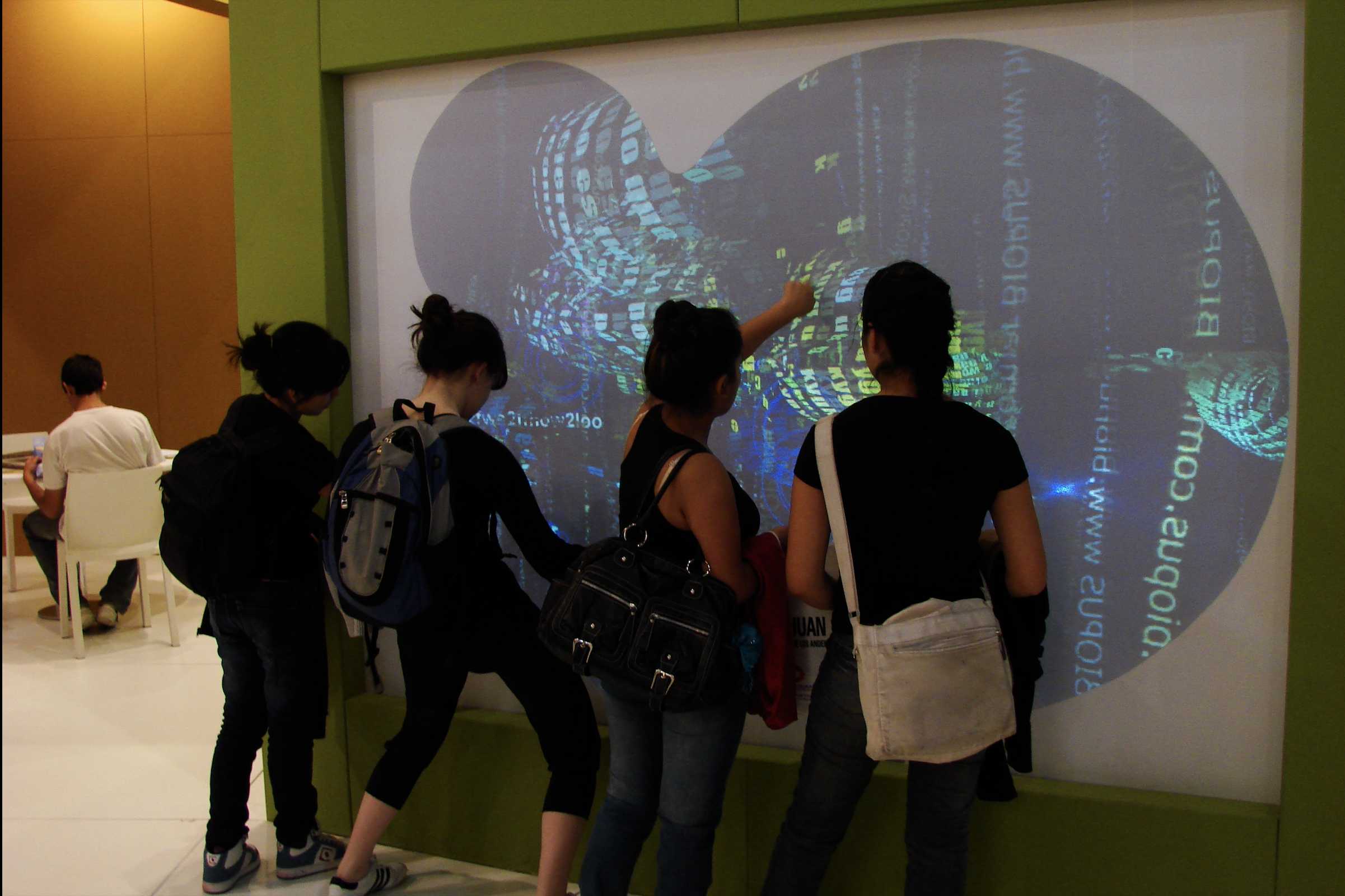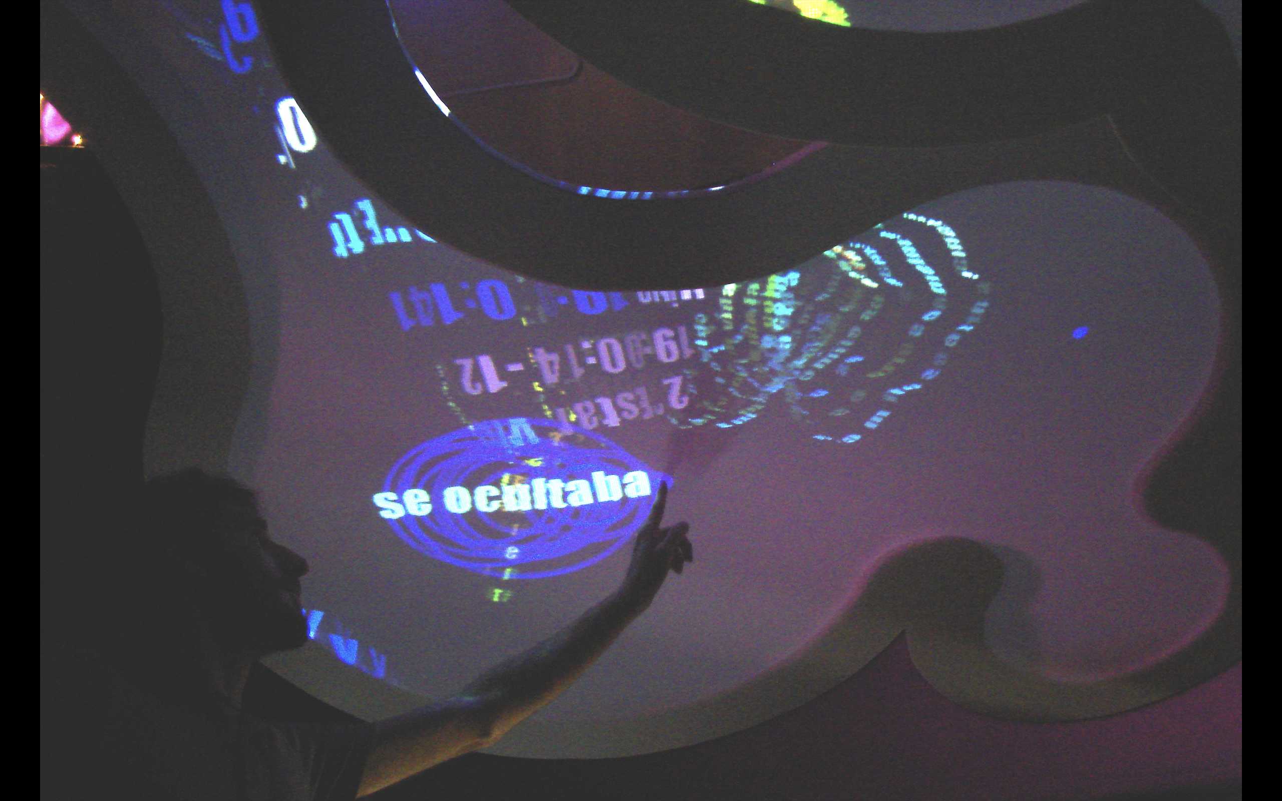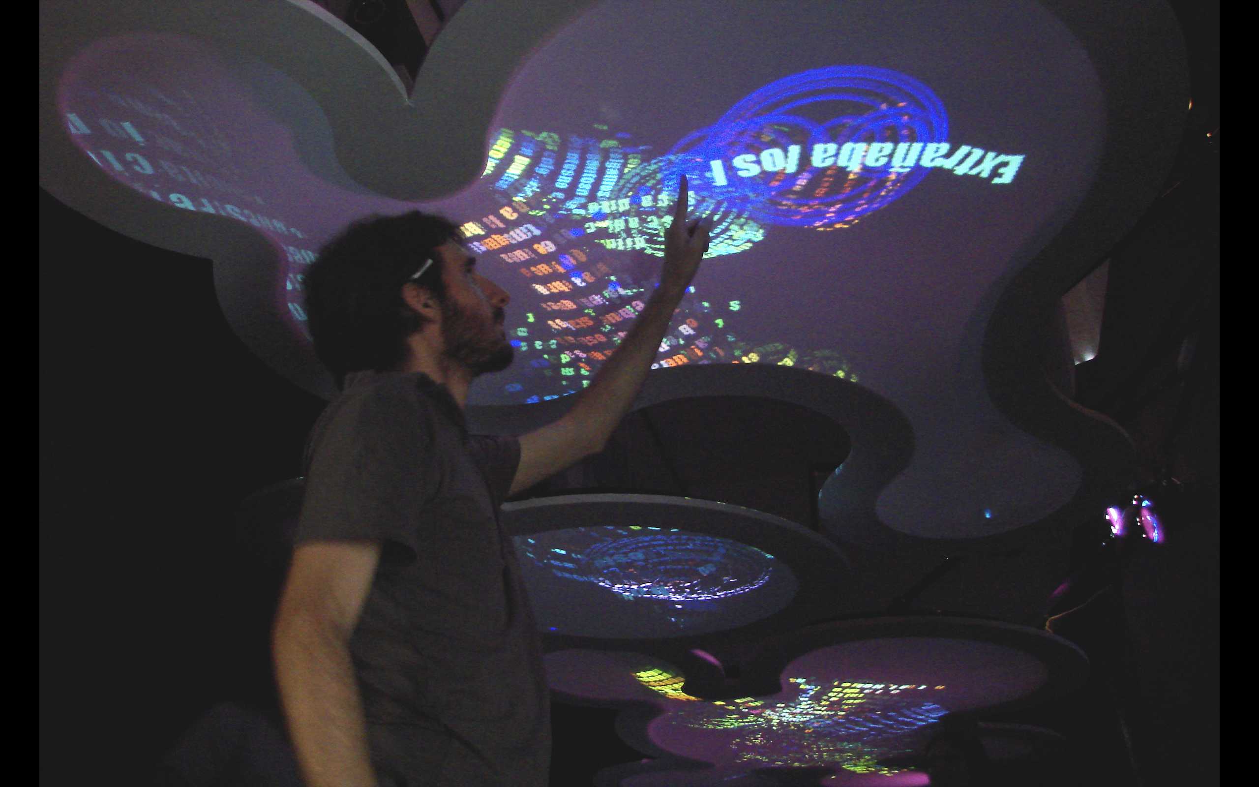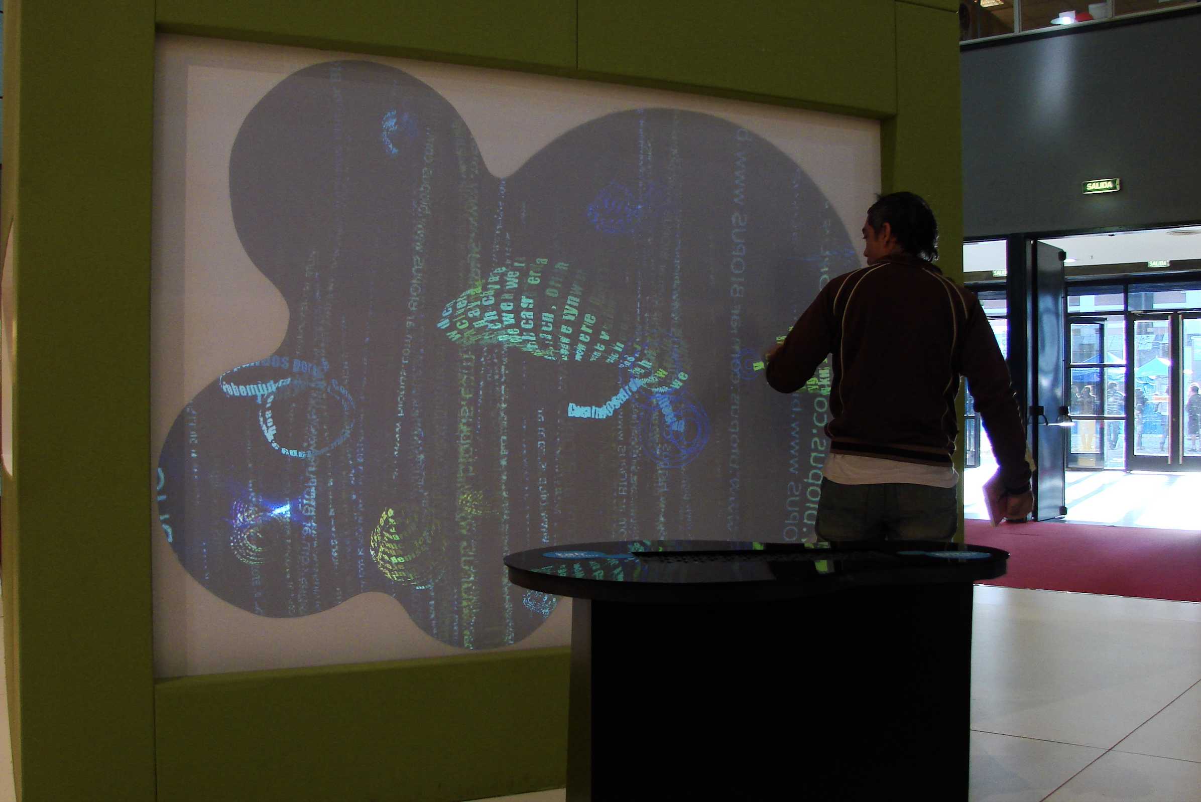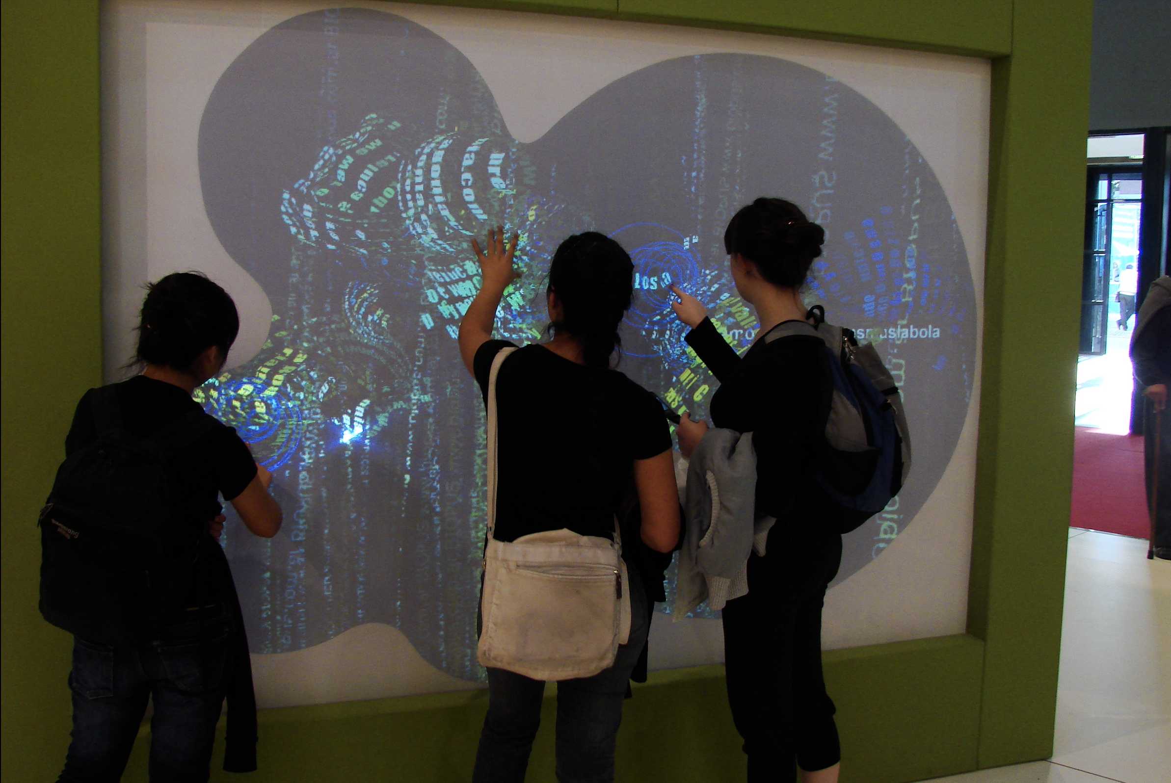Instalación con pantallas sensible al tacto gigante en donde mensajes de de SMS del público se transforman en criaturas virtuales que se alimentan de otros textos.