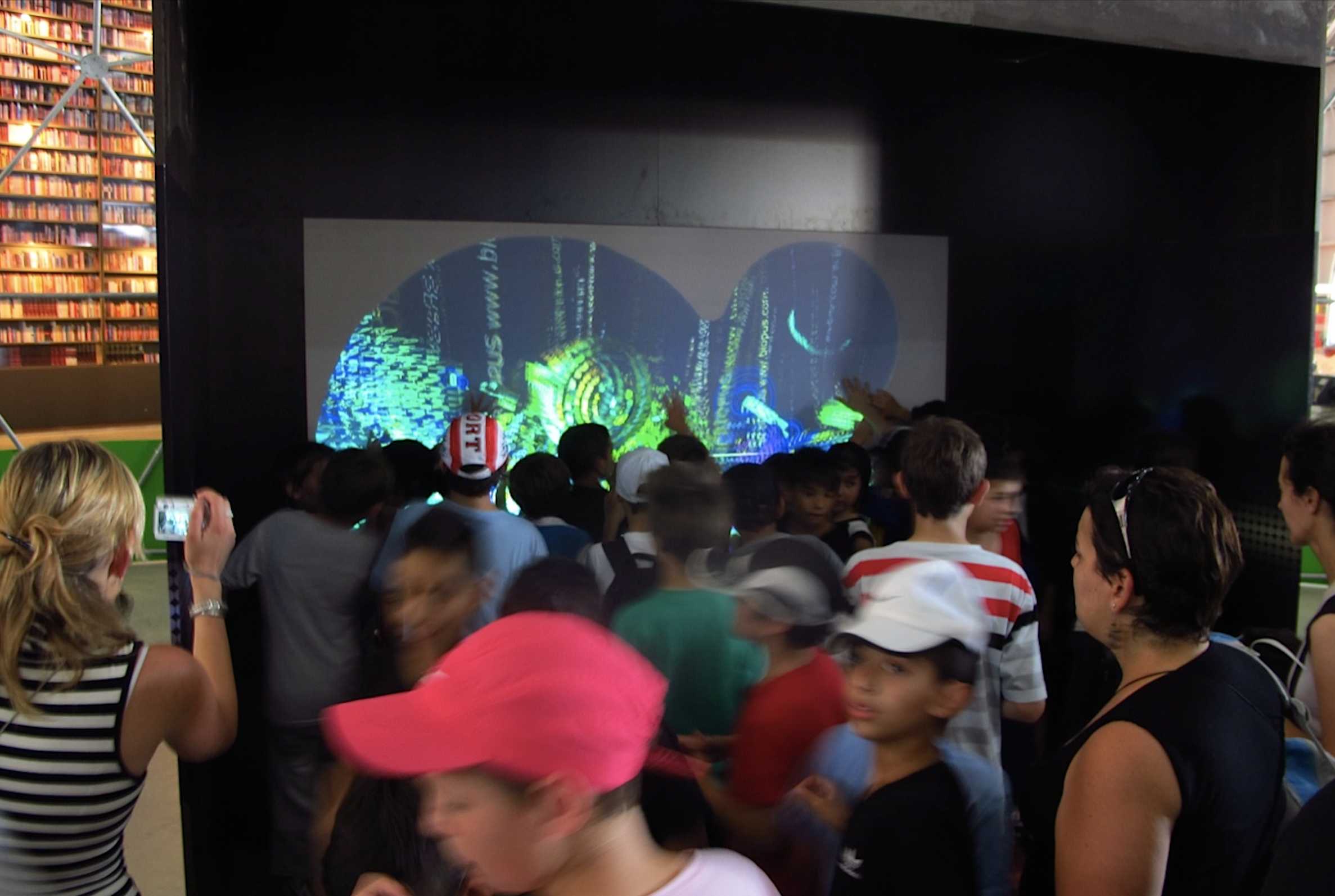 El público también puede interactuar con estos organismos a través de una pantalla sensible al tacto, que permite que la gente dé comida a estas criaturas. La forma en que el público alimenta este ecosistema, es generando textos con los trazos de sus manos en la pantalla, textos que surgen de escritos de autores argentinos como Borges, Cortazar, Arlt y otros.