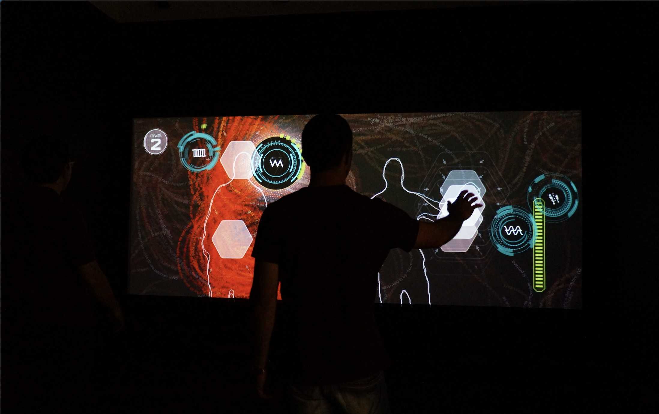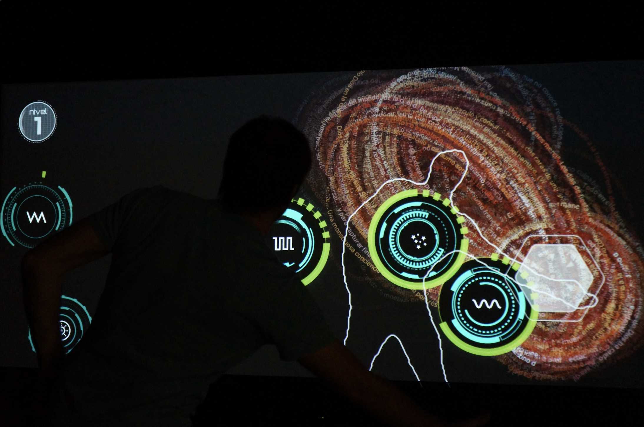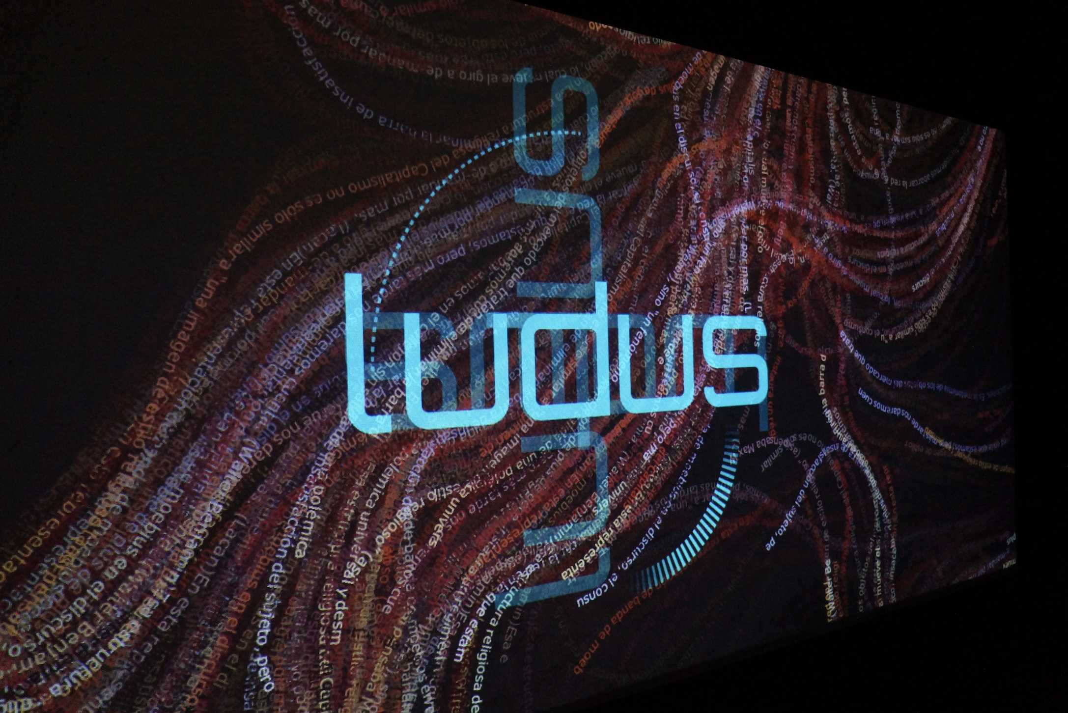 “Ludus” es un experimento que intenta investigar dos relaciones: 1) la del cuerpo y la obra, 2) la de la interactividad y el discurso. Se presenta como un videojuego en el que la meta es develar un texto que se encuentra incompleto, el mismo pertenece a una selección de citas de pensadores acerca de la Subjetividad y el Capitalismo. Para lograr completar el texto, el público debe comprometer su cuerpo en un juego donde sus movimientos coordinan un flujo de textos (como un río, un enjambre, una bandada de letras) para alimentar diferentes nodos musicales. En la medida que logra sostener todos los nodos alimentados va subiendo de niveles, y como resultado, develando nuevas letras del texto, para así descifrarlo. Pero, ¿qué sucede cuando el compromiso exigido al cuerpo en el juego es cada vez mayor? ¿qué sucede cuando, a pesar de realizar una entrega cada vez mayor, la promesa no es cumplida? Los textos, quizás, no lleguen a poder leerse, pero, ¿quedará en el cuerpo la huella de la interacción? ¿una huella que dé cuenta sobre la Subjetividad y el Capitalismo?