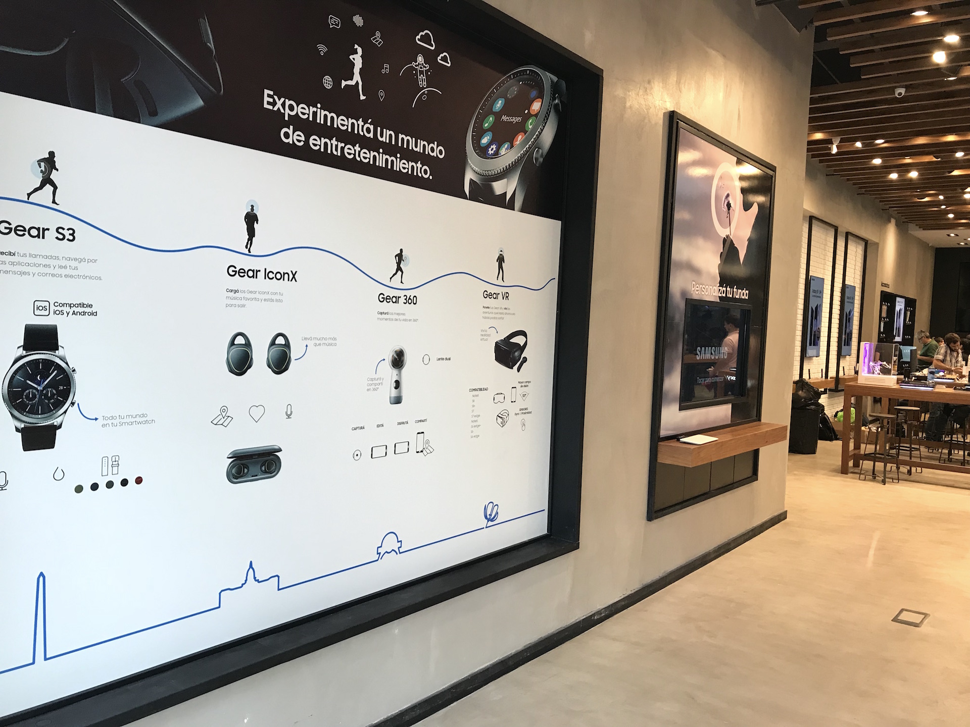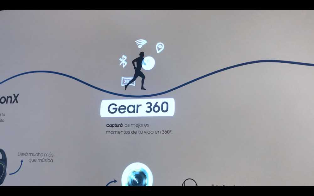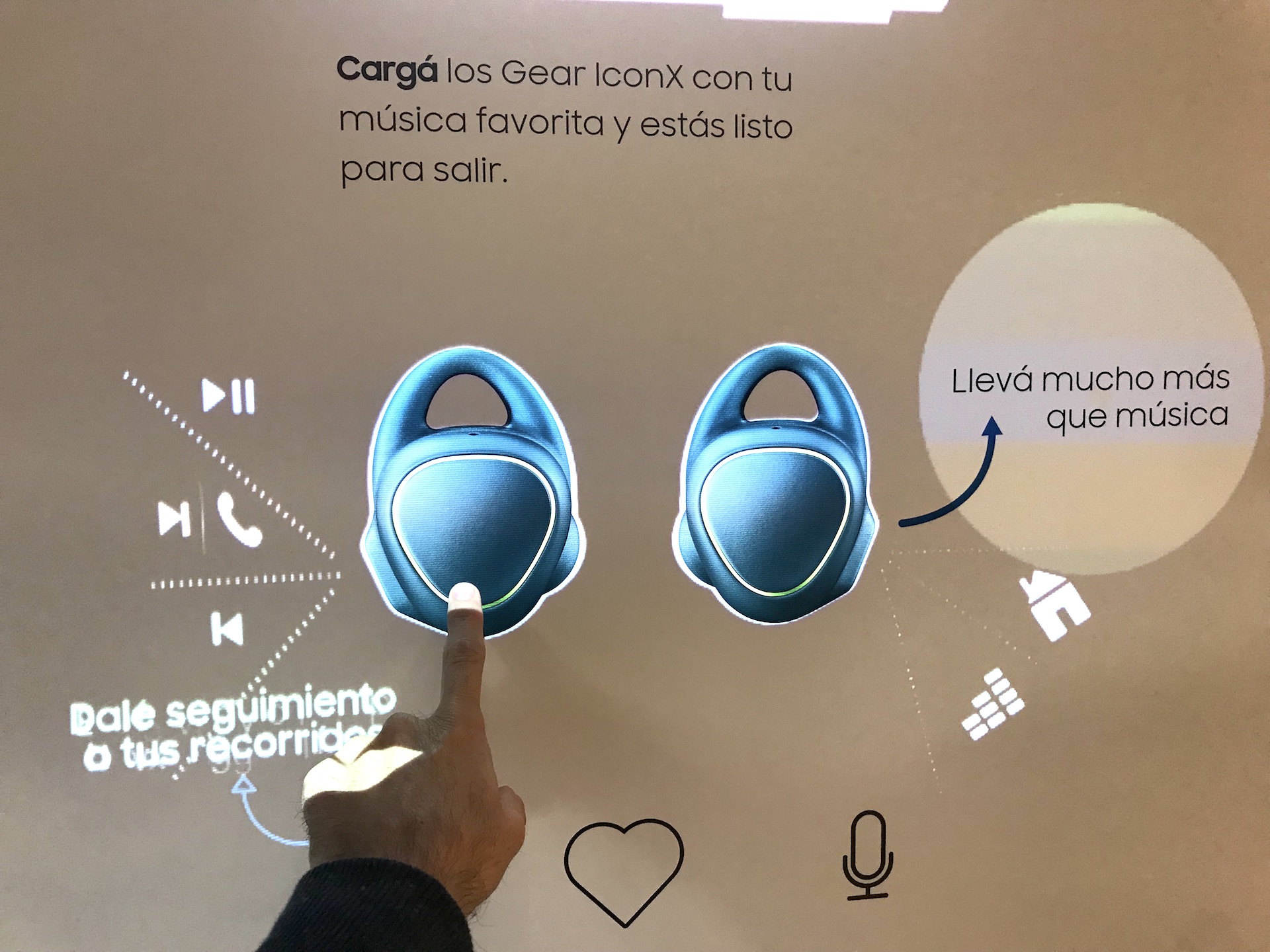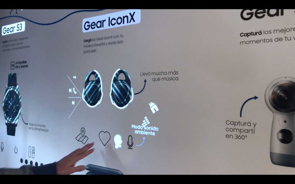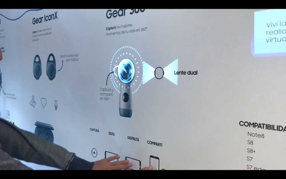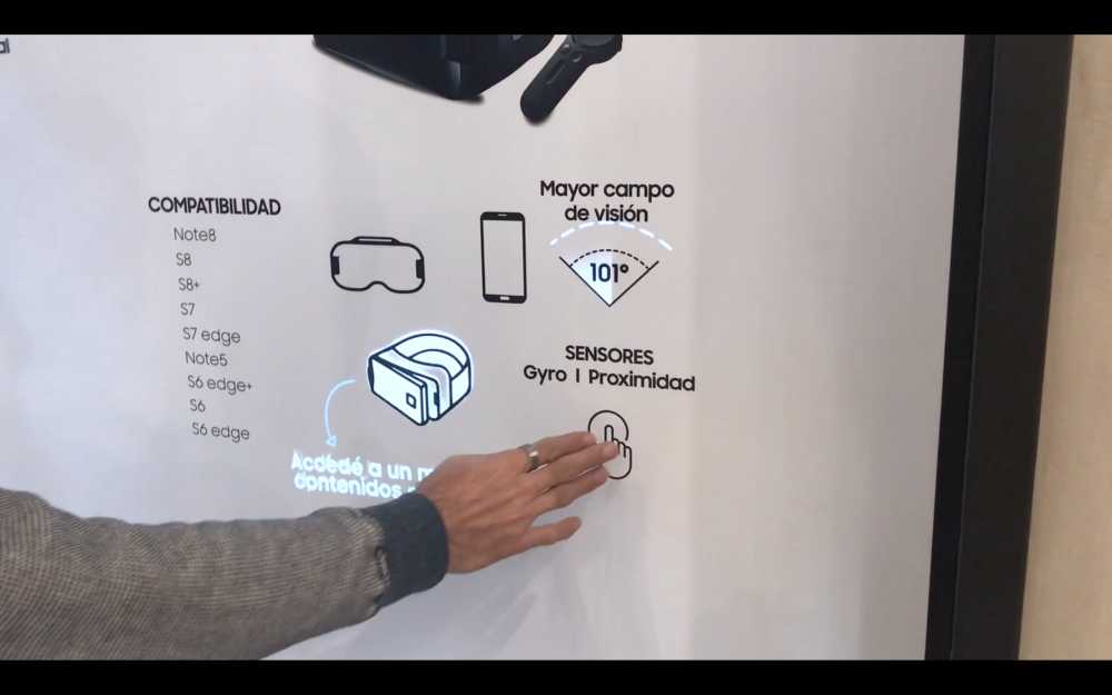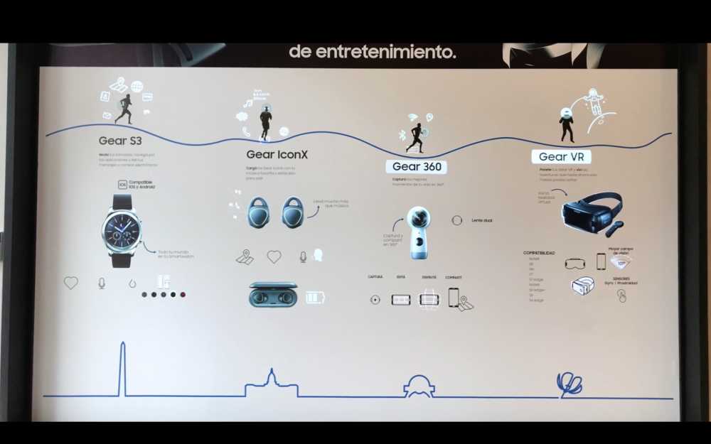 Sobre la superficie del panel, aparecían impresos el reloj inteligente Gear S3, los auriculares Gear Icon X, la cámara Gear 360 y el casco de realidad virtual Gear VR, junto con sus nombres e íconos representativos de sus características. Cada uno de estos elementos funcionaba como una zona sensible al tacto: al interactuar con ellos, se activaban animaciones que ilustraban sus funciones y capacidades en tiempo real.
