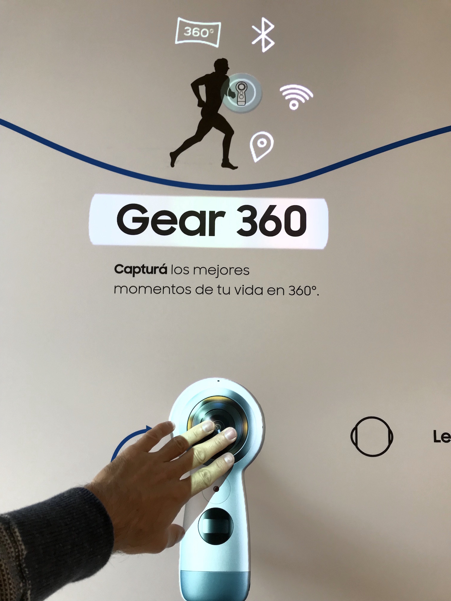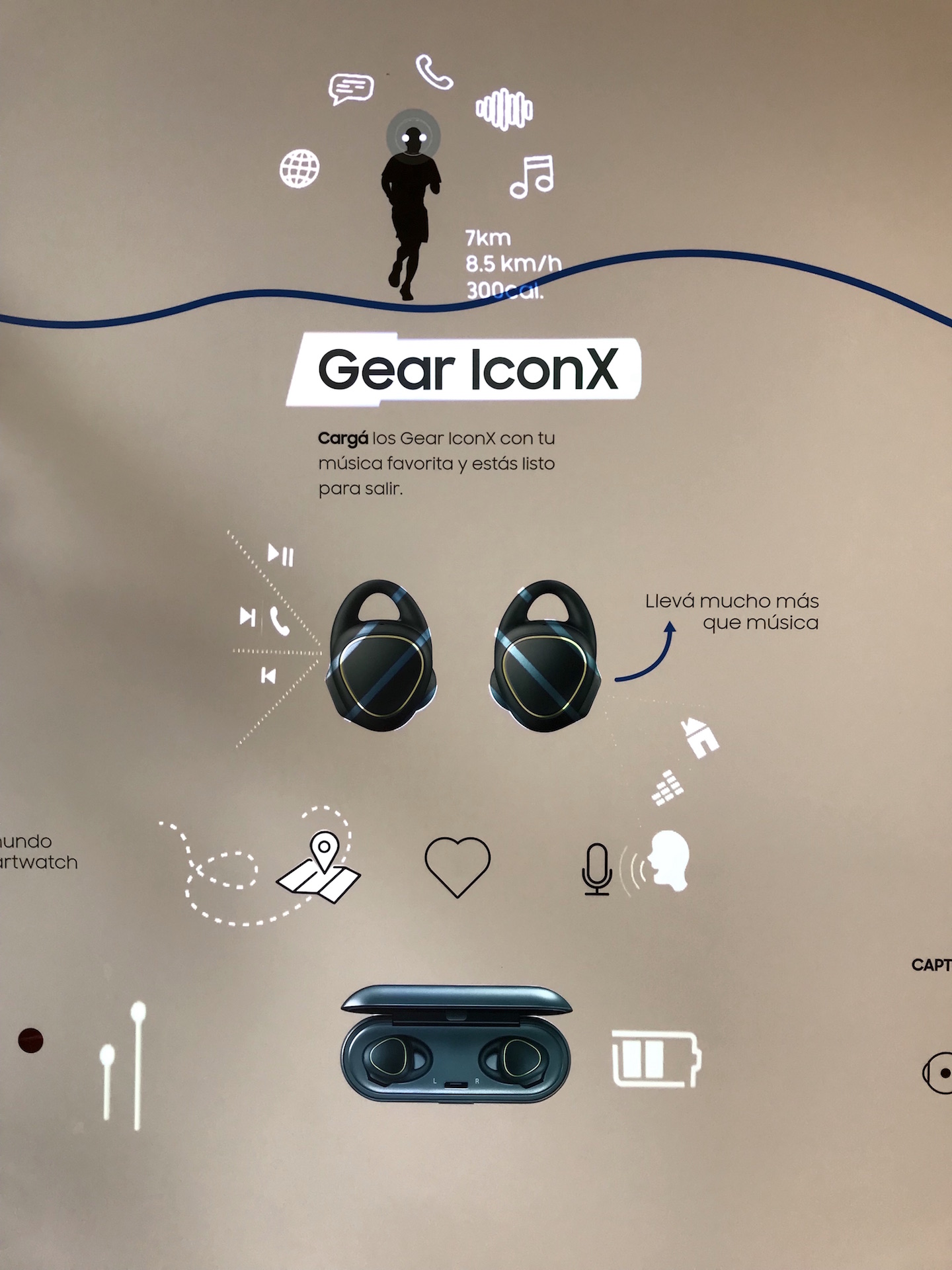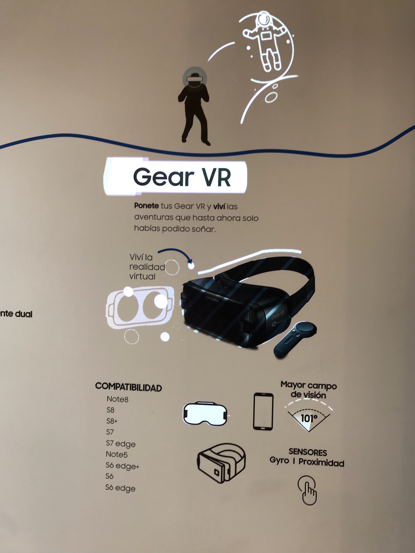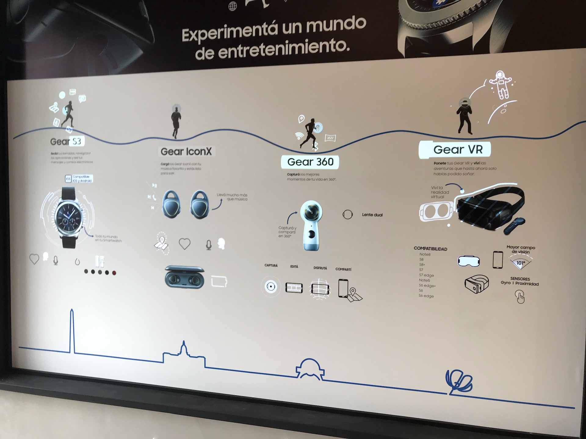 Sobre la superficie del panel, aparecían impresos el reloj inteligente Gear S3, los auriculares Gear Icon X, la cámara Gear 360 y el casco de realidad virtual Gear VR, junto con sus nombres e íconos representativos de sus características. Cada uno de estos elementos funcionaba como una zona sensible al tacto: al interactuar con ellos, se activaban animaciones que ilustraban sus funciones y capacidades en tiempo real.