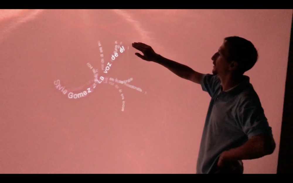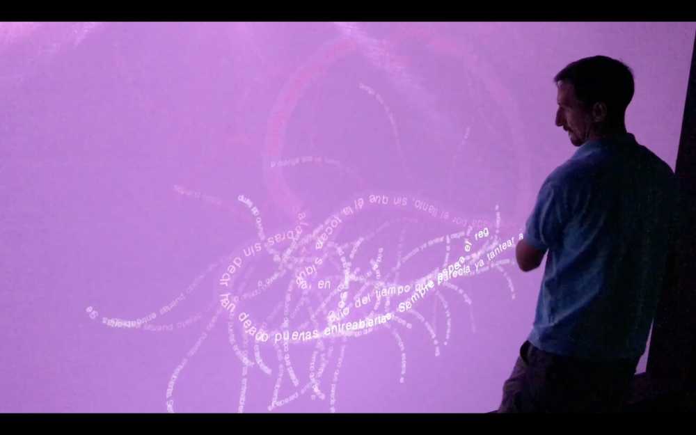 Sobre una gran pantalla elástica y sensible al tacto de 5 metros de ancho, los textos emergen a medida que los visitantes deslizan sus dedos, revelando palabras escondidas y estableciendo un vínculo físico con la escritura.