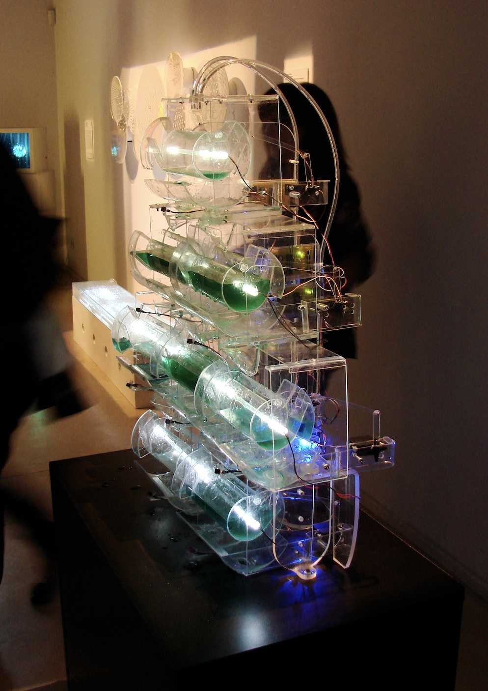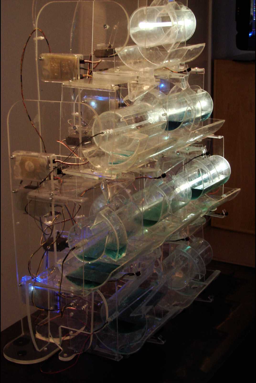 El líquido que fluye por el sistema es agua, proveniente de dos repositorios diferentes, uno de ellos posee agua teñida de un tenue color azul, el otro posee agua teñida de verde. Estos colores fueron elegidos como representación del agua y la vida respectivamente. En el caso del agua teñida de azul su color será para destacar su presencia en contraposición a la transparencia del acrílico. Cada repositorio pertenece a un sistema que se retroalimenta, ya que unas pequeñas bombas (de muy bajo costo) elevan sus contenido hasta la primer célula de la parte superior, turnando el color según diferentes criterios. Los circuitos de agua nunca se mezclan, es decir, un recipiente sólo puede poseer un color por vez, por eso el sistema lleva un registro de la forma en que está distribuidos los colores para que al final de la cadena de vertidos, la última hilera de vuelva a colocar los colores en los recipientes que le corresponden.