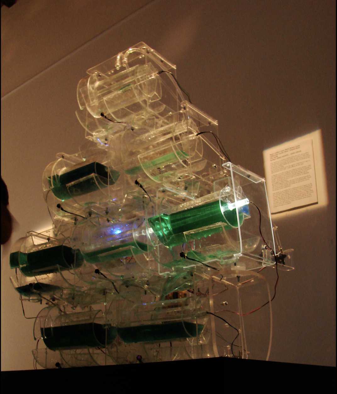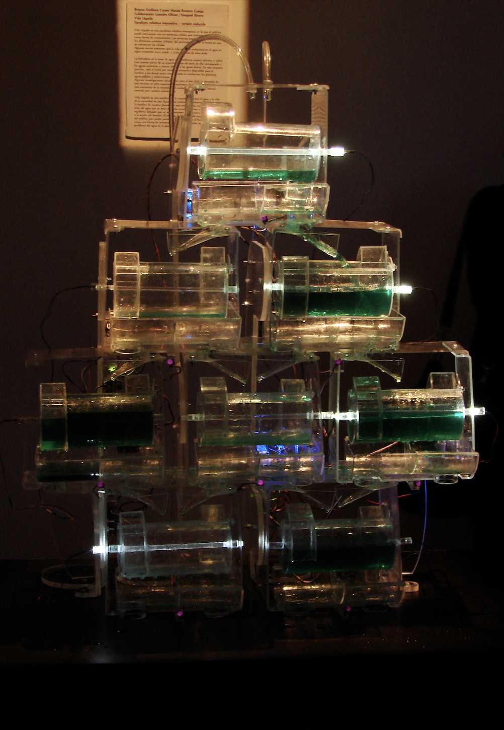 Vida Líquida es una escultura conformada por un autómata celular a base de agua: El autómata se constituye de un conjunto de recipientes acrílicos con formas semicilíndricas (las células) que son capaces de contener y verter agua en los recipientes vecinos. Cada recipiente recibe agua de un vecino ubicado arriba y es capaz de elegir entre dos de sus vecinos inferiores para arrojar su contenido. El autómata es una matriz de módulos (cada recipiente semicilíndrico) que, en forma sintética, dibujan la forma de una gota.