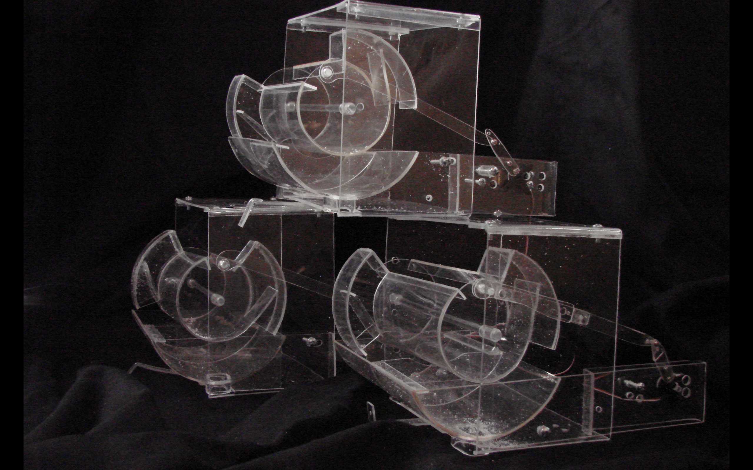 Cada módulo puede girar, y en función de que su giro sea en sentido horario o antihorario (visto desde su costado derecha), verterá su contenido en el recipiente que se encuentra más a su derecha o izquierda.
